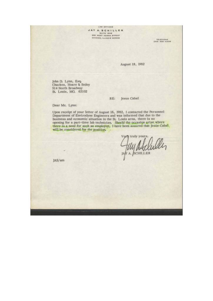 В вышеупомянутым письмом от 18 августа 1982 года и написаны адвоката для работодателя "Envirodyne инженеров" был направлен в одну из Иисуса Кабаль в адвокаты после того, как он жаловался на дискриминацию. Это же полностью противоречит любой аргумент, что такие компании не предлагают полный рабочий день, г-Кабаль-за отсутствия какой-либо квалификации.