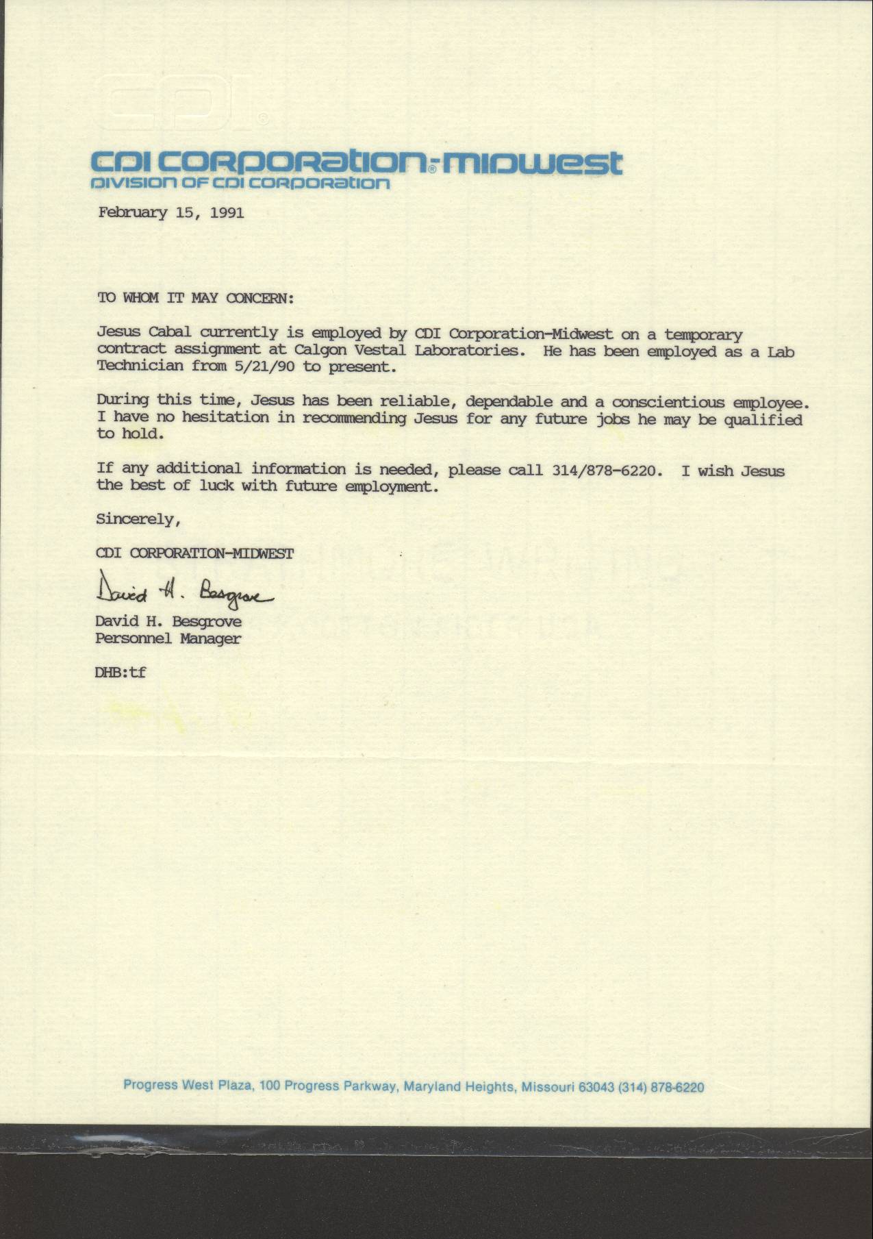 16. ANOTHER GREAT APPRAISAL! This exhibit is also a great letter of recommendation issued on behalf of Jesus Alberto Cabal by his former boss from ”C.D.I Incorporated" on February the 15th of the year 1991 in West Port, Missouri. |