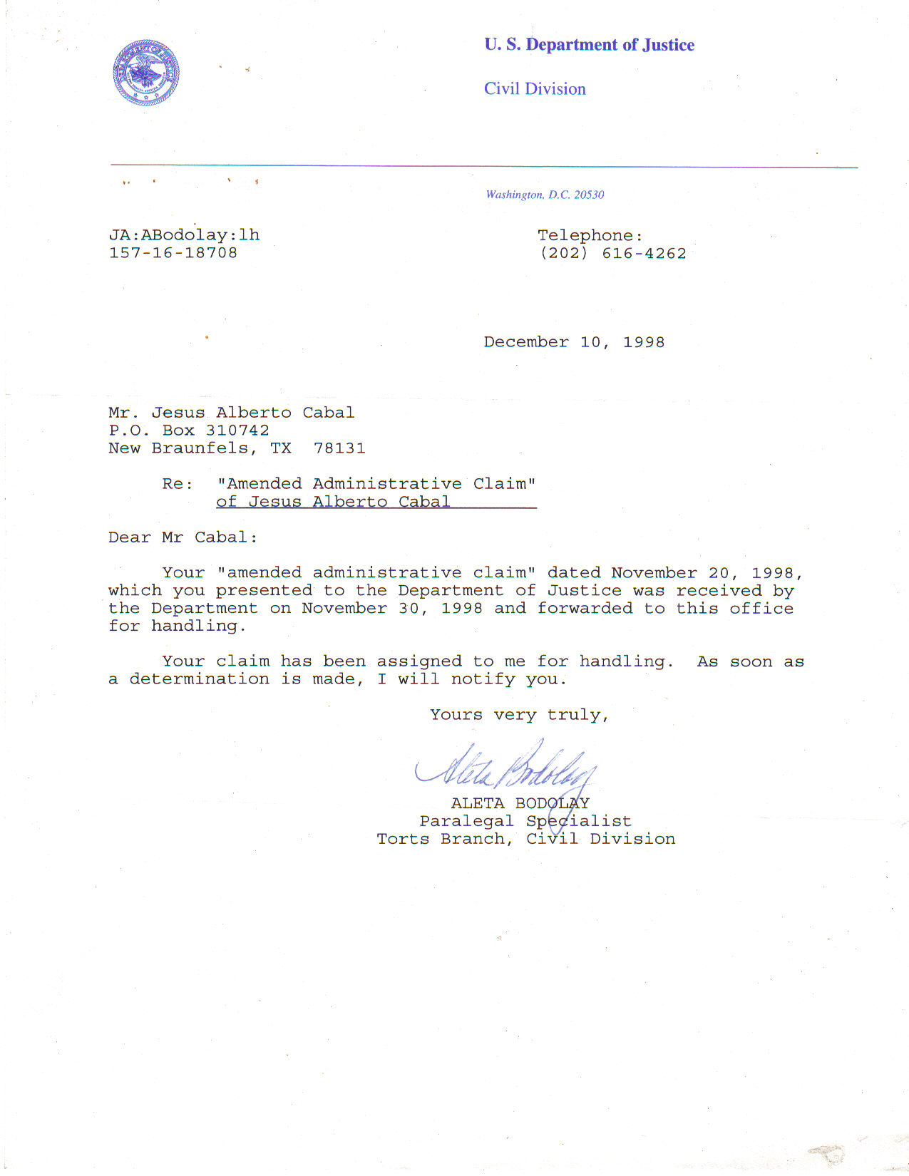 22. EVIDENCE OF THE FILING OF AN "ADMINISTRATIVE CLAIM" WITH THE DEPARTMENT OF JUSTICE BY JESUS CABAL AGAINST FORMER PRESIDENTS OF THE UNITED STATES: GEORGE BUSH Sr. AND RONALD REAGAN, AMONG OTHERS. This letter from the Civil Division of the Department of Justice (D.O.J) was sent to Jesus Alberto Cabal on December 10 of 1998 to acknowledge receipt of an "Administrative Claim" against several former presidents of the United States