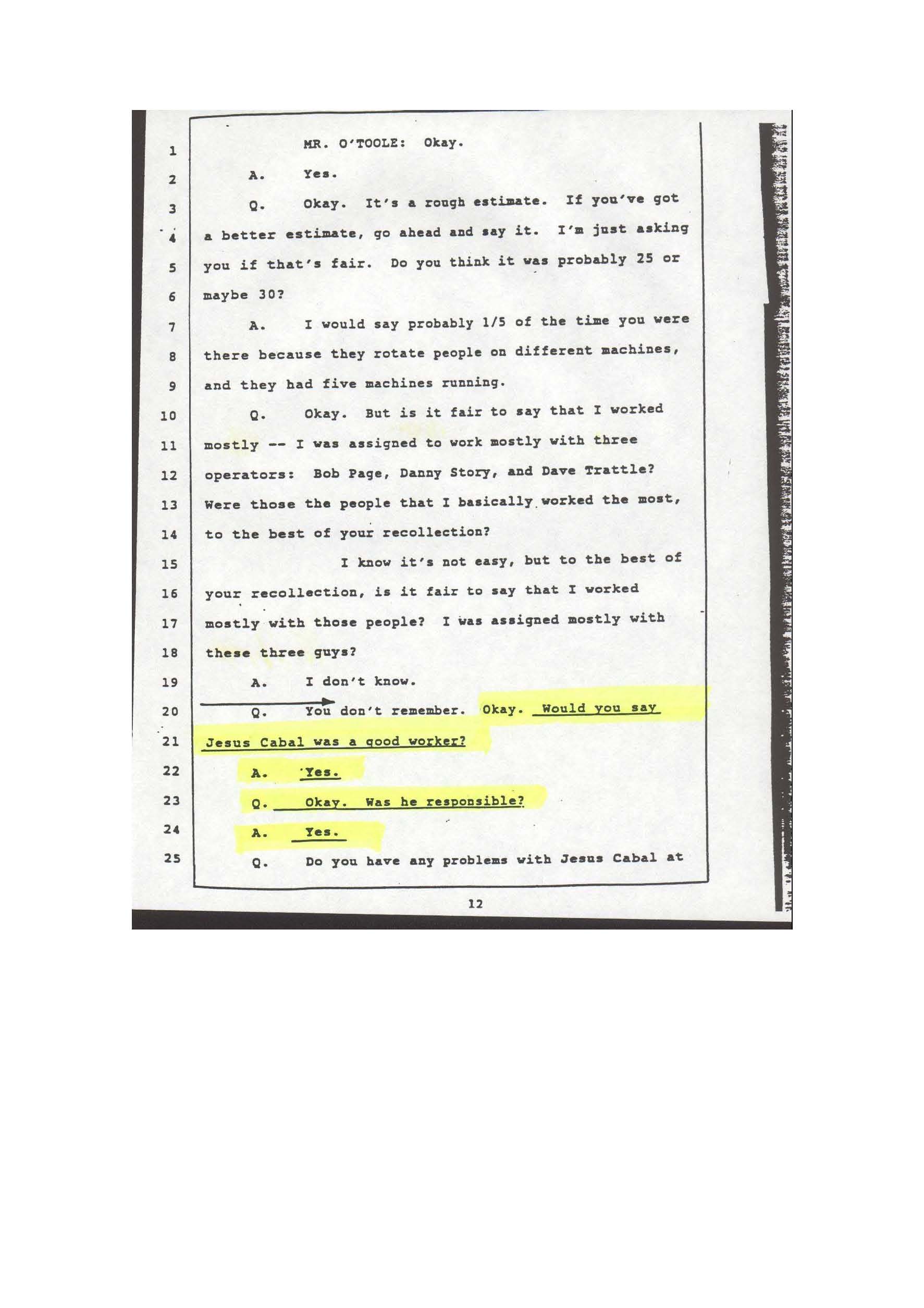 9. FURTHER PROOF OF BEING A GOOD EMPLOYEE! This is page # 12 of the deposition given by Mr. Robert Page from "Tetraplastics, Inc.", in which he clearly states that Jesus Alberto Cabal was in fact a good worker, and overall a responsible employee when he was employed by employer "Tetraplastics" in the city of Saint Louis, Missouri. |