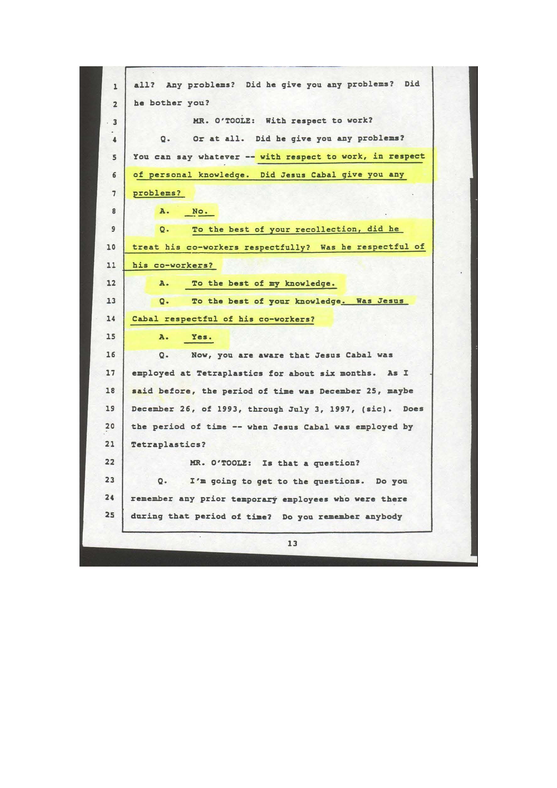 10. EVIDENCE OF BEING RESPECTFUL! This is page # 13 of the deposition given by Mr. Robert Page from "Tetraplastics, Inc.", in which he clearly states that Jesus Alberto Cabal was in fact very respectful of everyone when he was employed by "Tetraplastics, Inc." in the city of Saint Louis, Missouri. |