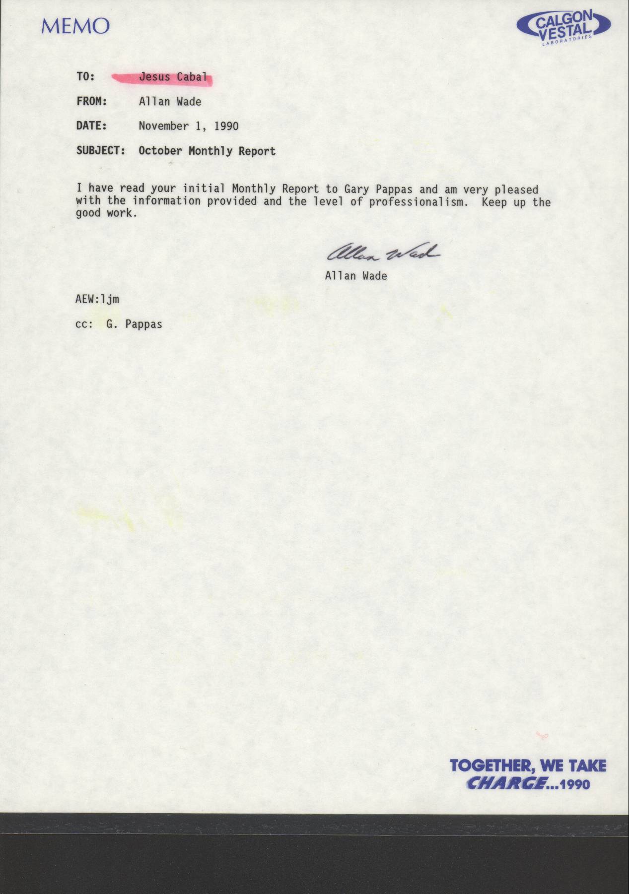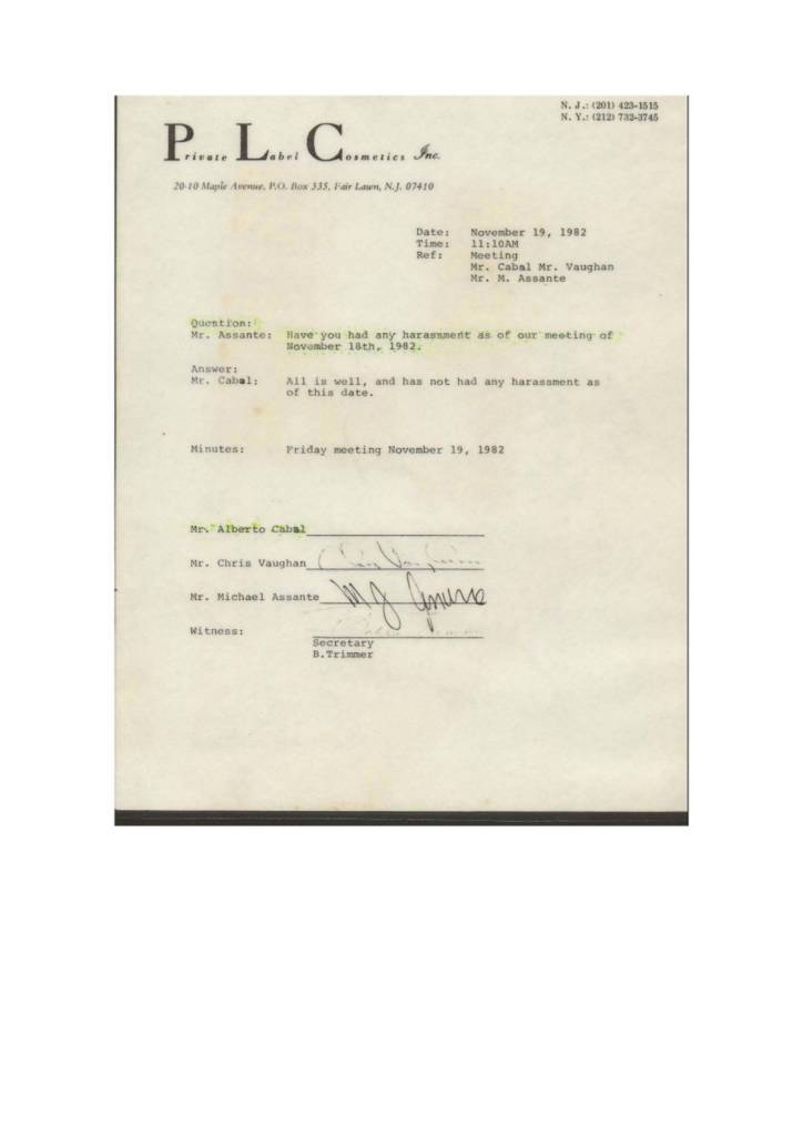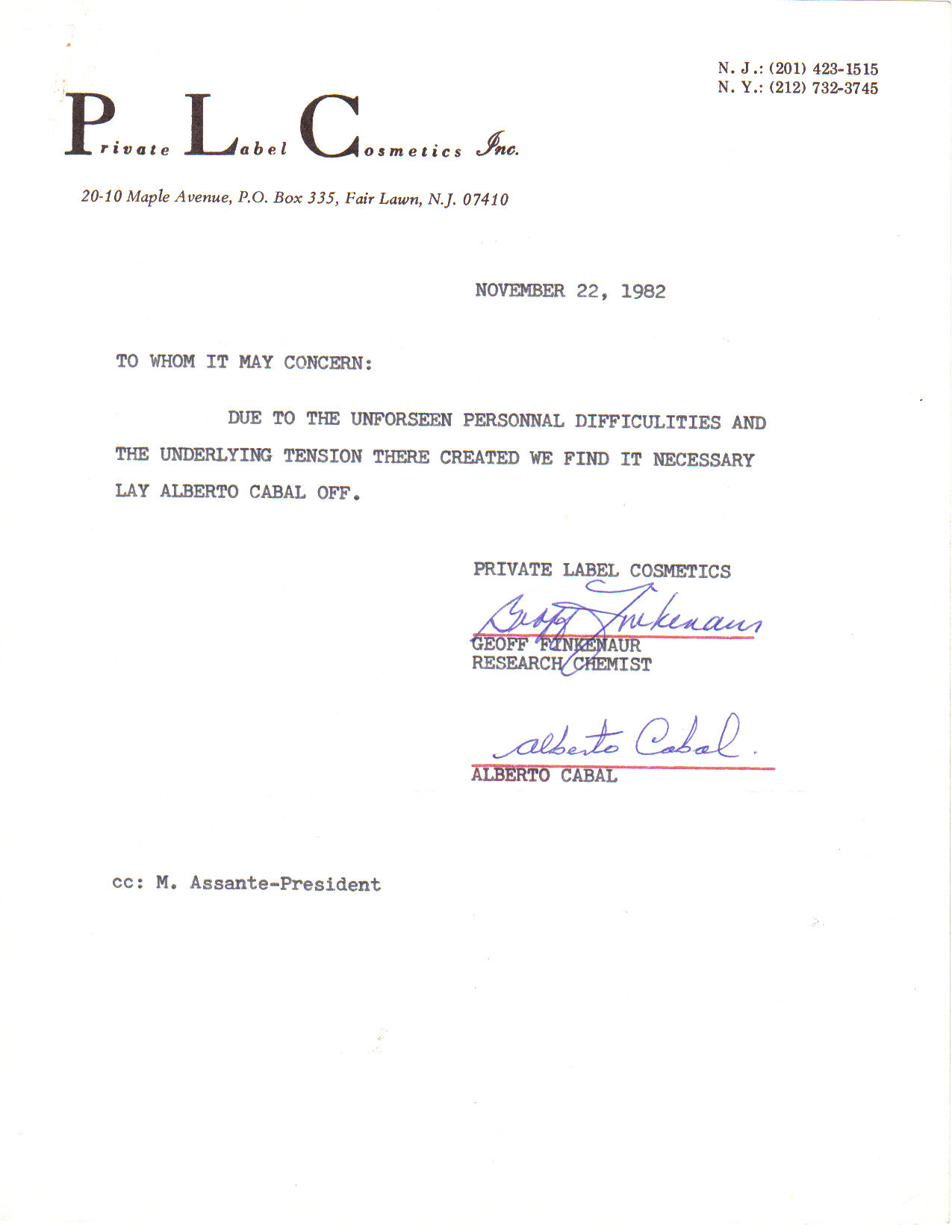 8. MORE EVIDENCE THAT JESUS ALBERTO CABAL WAS DISMISSED FROM PRIVATE LABEL COSMETICS IN AN ACT OF RETALIATION. This letter which was signed by Jesus Alberto Cabal and his former supervisor at PLC indicates that management at said company had lost control of the situation in the laboratory at the time that Jesus Alberto Cabal complained of