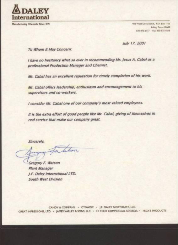 13. EXCELLENT LETTER OF RECOMMENDATION! This exhibit is a letter of appraisal issued on behalf of Jesus Alberto Cabal by his former boss from ”Daley International” on July the 17th of the year 2001 in Luling, Texas. |