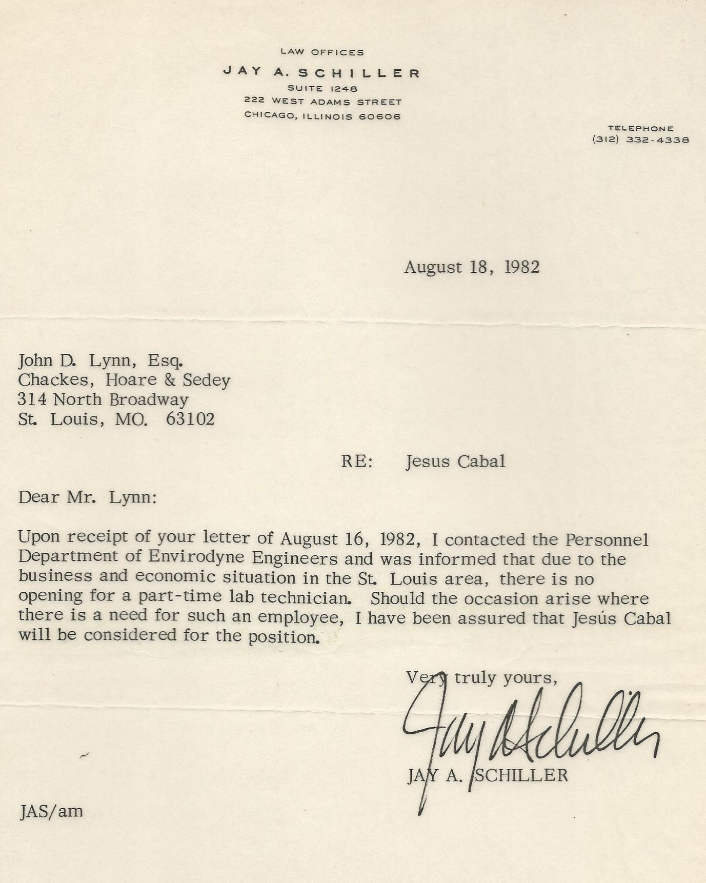 Compelling evidence of Mr. Cabal´s habilities and qualifications to do his job was given during the year of 1982 when an Envirodyne Engineers´attorney, a Mr. Jay Schiller, clearly stated Envirodyne´s willingness to re-hire Mr. Cabal at a later date. Such a statement was written after Jesus Cabal filed his discrimination charges against "Envirodyne".