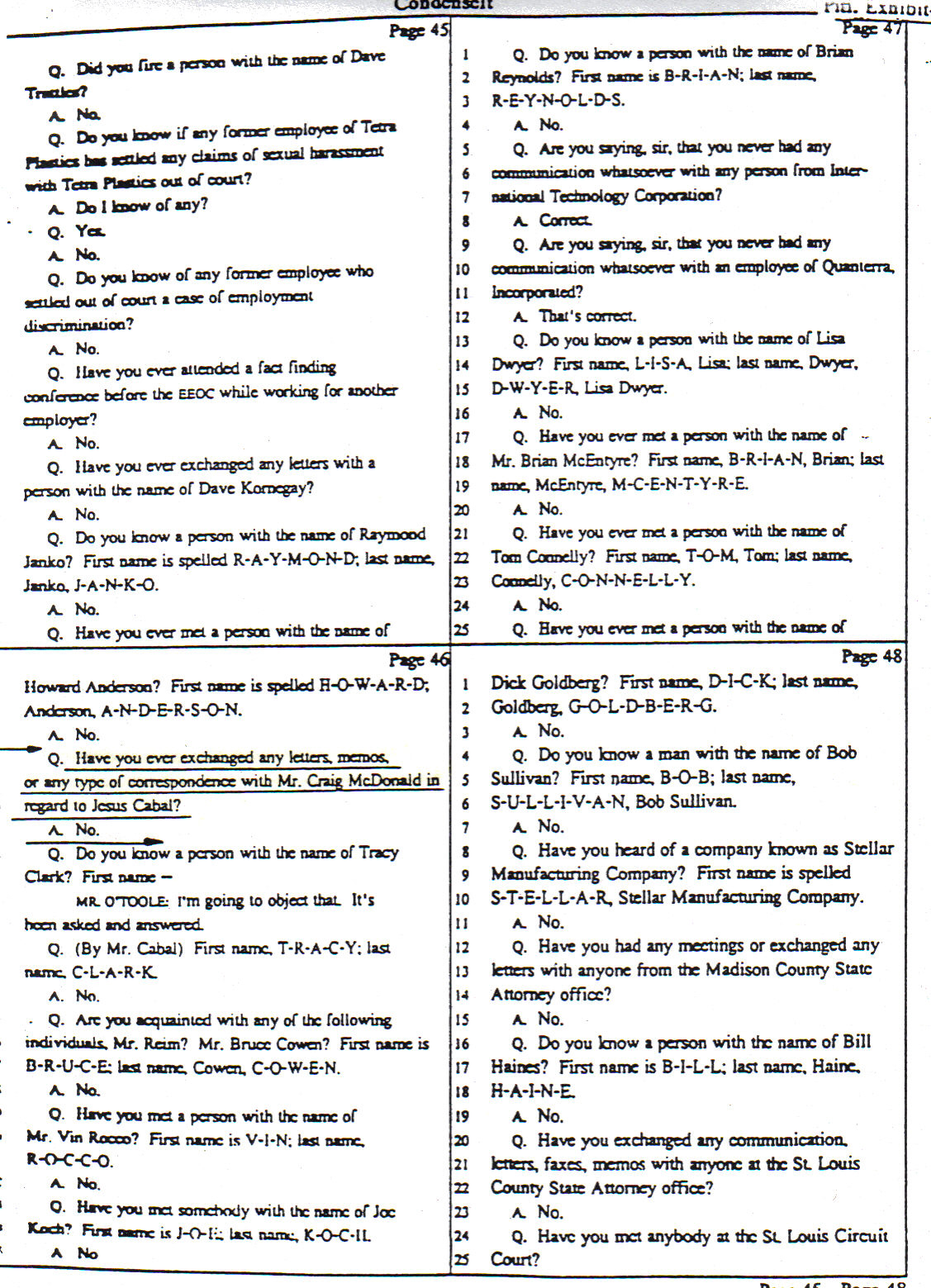 12a. ADDITIONAL CONFIRMATION OF BEING A GOOD EMPLOYEE. Again, this exhibit does show the testimony of the former director of personnel for Tetraplastics, Inc. a Mr. Jim Reim, who in his deposition (under oath) stated that he never received any written complains from the supervisor of Jesus Alberto Cabal (Craig MacDonald) at such Plant. Please, do refer to lines 4 through 7 of page 46 |
