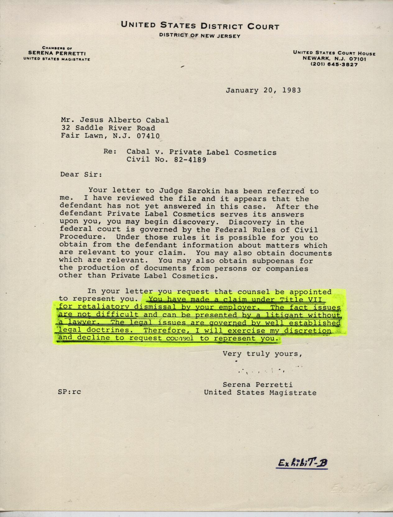 18. A PREJUDICED JUDGE? This is a letter mailed to Jesus Alberto Cabal in 1983 by New Jersey´s U.S. District Judge Perretti in which she refused to appoint him an attorney to represent him on the grounds that retaliation claims are very easy to prove without a lawyer. The irony of her statements is that thereafter the judge denied most of Mr. Cabal´s petitions or "Motions" filed with the court. In fact, the second paragraph of the letter shows that the judge had been prejudiced against Jesus Alberto Cabal, or perhaps ordered by high ranking officials of the Reagan-Bush Administration to deny him a fair trial. |