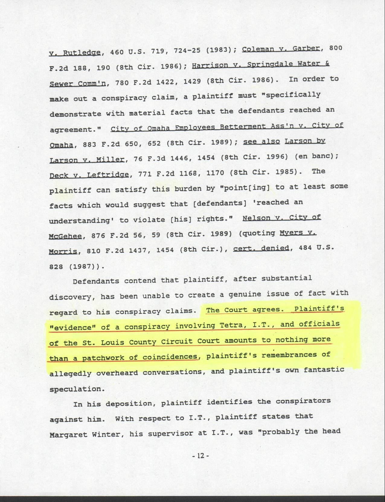 19. ANOTHER PREJUDICED JUDGE? This is page #12 of an order issued by Federal Judge Perry from the U.S. District Court for the Eastern District of Missouri. In such order the judge does refer to the evidence presented to the court by Mr. Cabal as nothing else than a “Patchwork of Coincidences", and thereafter dismissed his claim going as far as imposing fines on Mr. Cabal in an attempt to intimidate him. The irony about her statement is that Rule 56 of the Federal Rules which governs matters dealing with summary judgment literally prohibits any judge from dismissing a law suit in which there is such a "Patchwork of Coincidences". In fact, the law on such issues clearly compels federal judges acting under similar circumstances to allow the matter to proceed to a trial before an impartial jury for a proper disposition of the claim. Of course, this is something that Judge Perry refused to do. The same Judge also refused Mr. Cabal´s request that the news media be allowed to openly report the proceedings to the public as to ensure transparency. The conduct of the judge can not be explained in any rational manner other than she had been instructed by high government officials in the United States to deny due process of law to Mr. Cabal. |