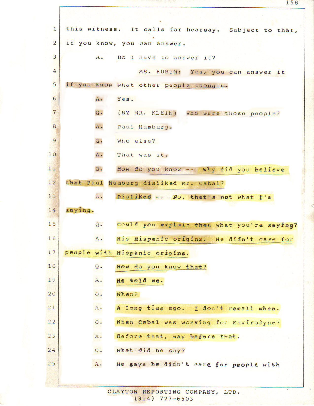 This is page 158 of Mr. Paul Myers´ deposition in which he clearly states that a senior employee of Envirodyne Engineers, Inc., had told him that he was prejudiced against people of Hispanic heritage before Jesus Alberto Cabal had joined "Envirodyne" as an employee.
