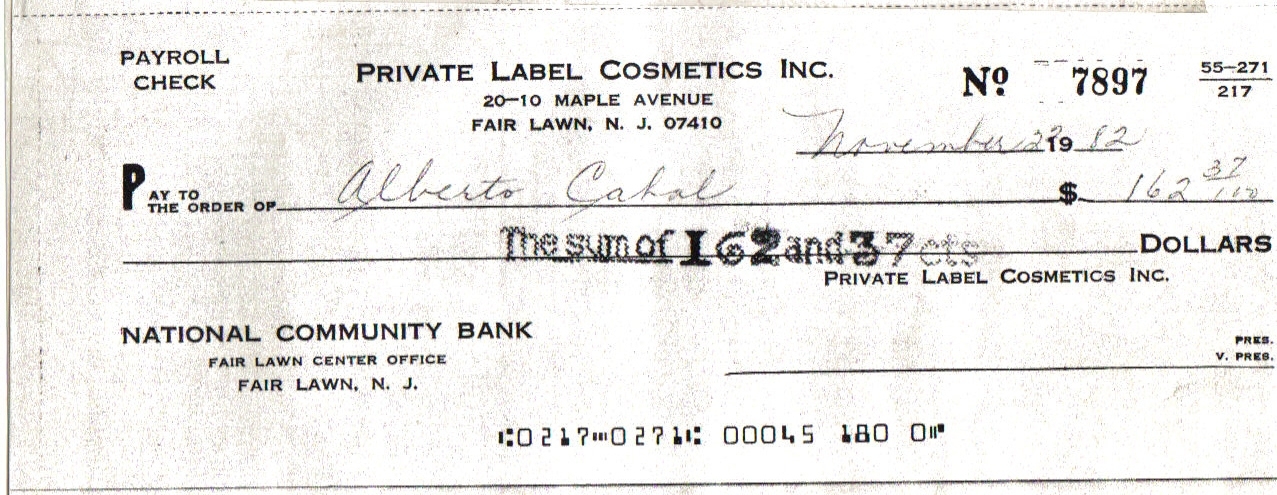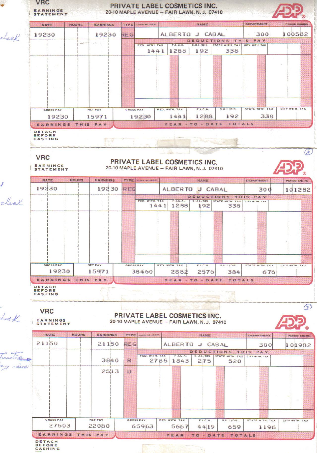 7a. MORE EVIDENCE OF INTIMIDATION AND RETALIATION BY "P.L.C". This is a copy of three paychecks given to Jesus Alberto Cabal by "Private Label Cosmetics". As seen, the first two (2) do not reflect a pay raise which was offered to all the employees of the company except him during October of 1983. The action was done in a clear attempt to harass and intimidate him for having