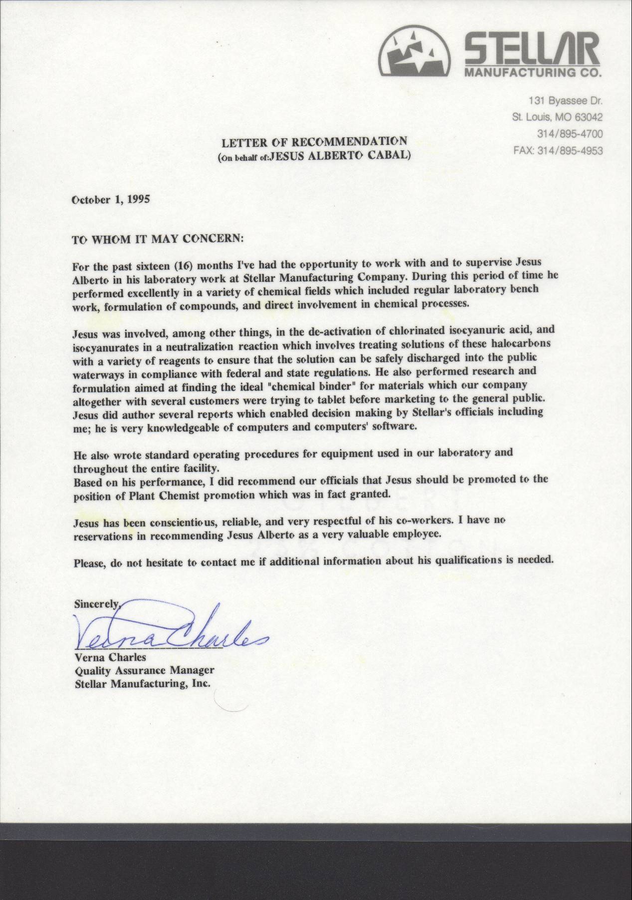 14. AN IMPRESSIVE LETTER OF RECOMMENDATION! This exhibit is also a great letter of appraisal issued on behalf of Jesus Alberto Cabal by his former boss from ”Stellar Manufacturing Company” on October the 1st of the year 1995 in Hazelwood, Missouri. |