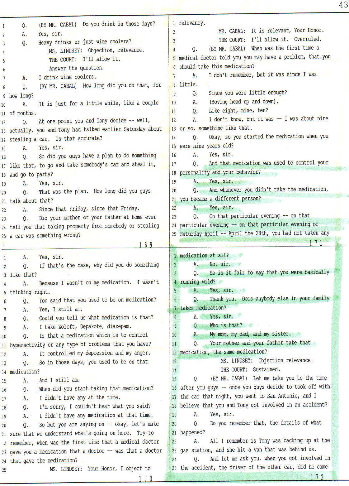 On pages 170 and 171 of her testimony before the jury Ms. Samantha Nicole Briones, the alleged victim going into detail about the fact that she is a diagnosed schizophrenic, and that in fact all the members of her dysfunctional family take a variety of drugs which are prescribed for mentally ill people. She corroborates such fact in those 2 pages by stating that she used to turn into a “different person” when she was not taking said drugs. In fact, she goes on to say that a few days before approaching Mr. Cabal she had stopped taking the prescriptions at issue and thereafter was “running wild”.