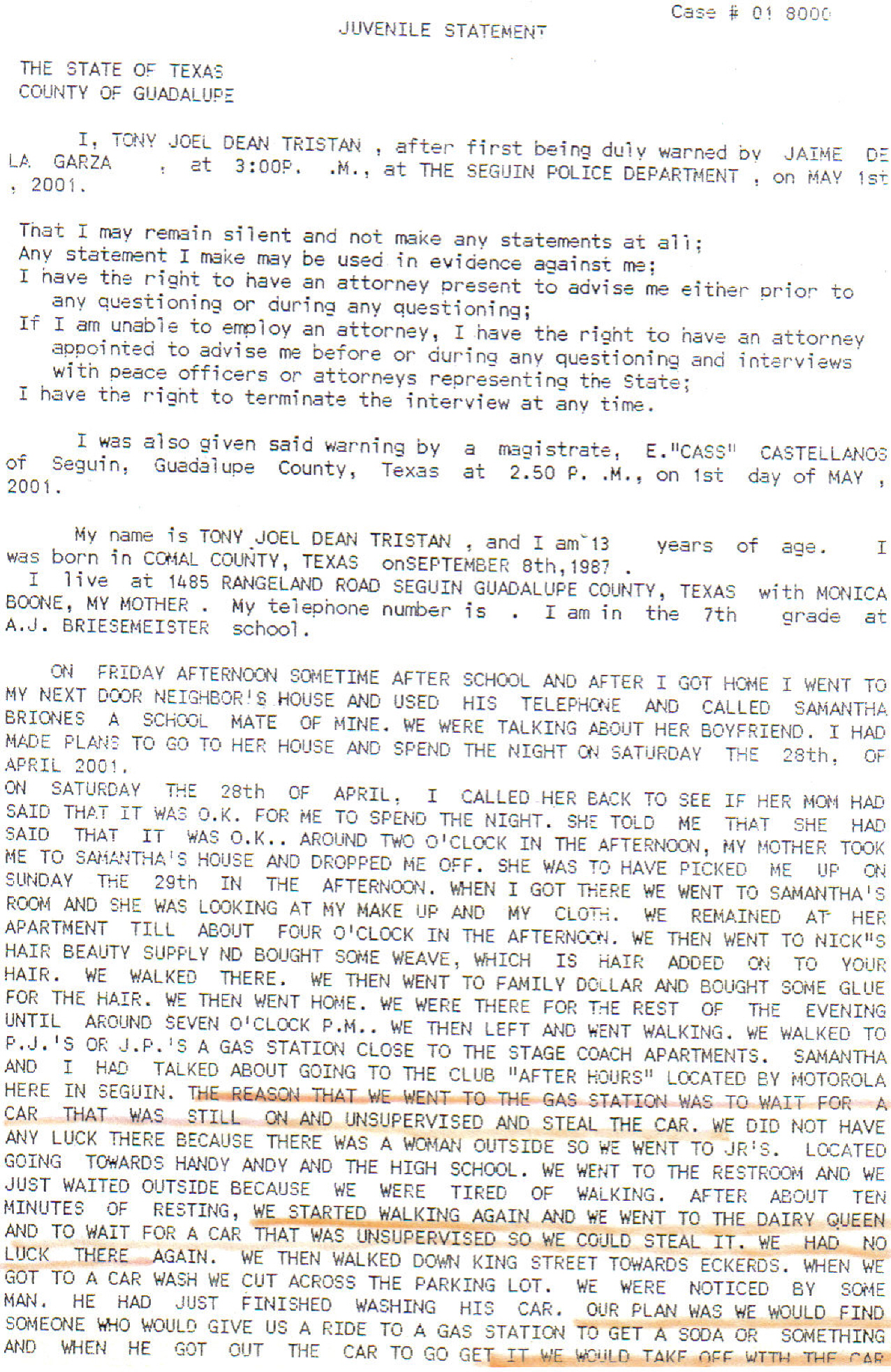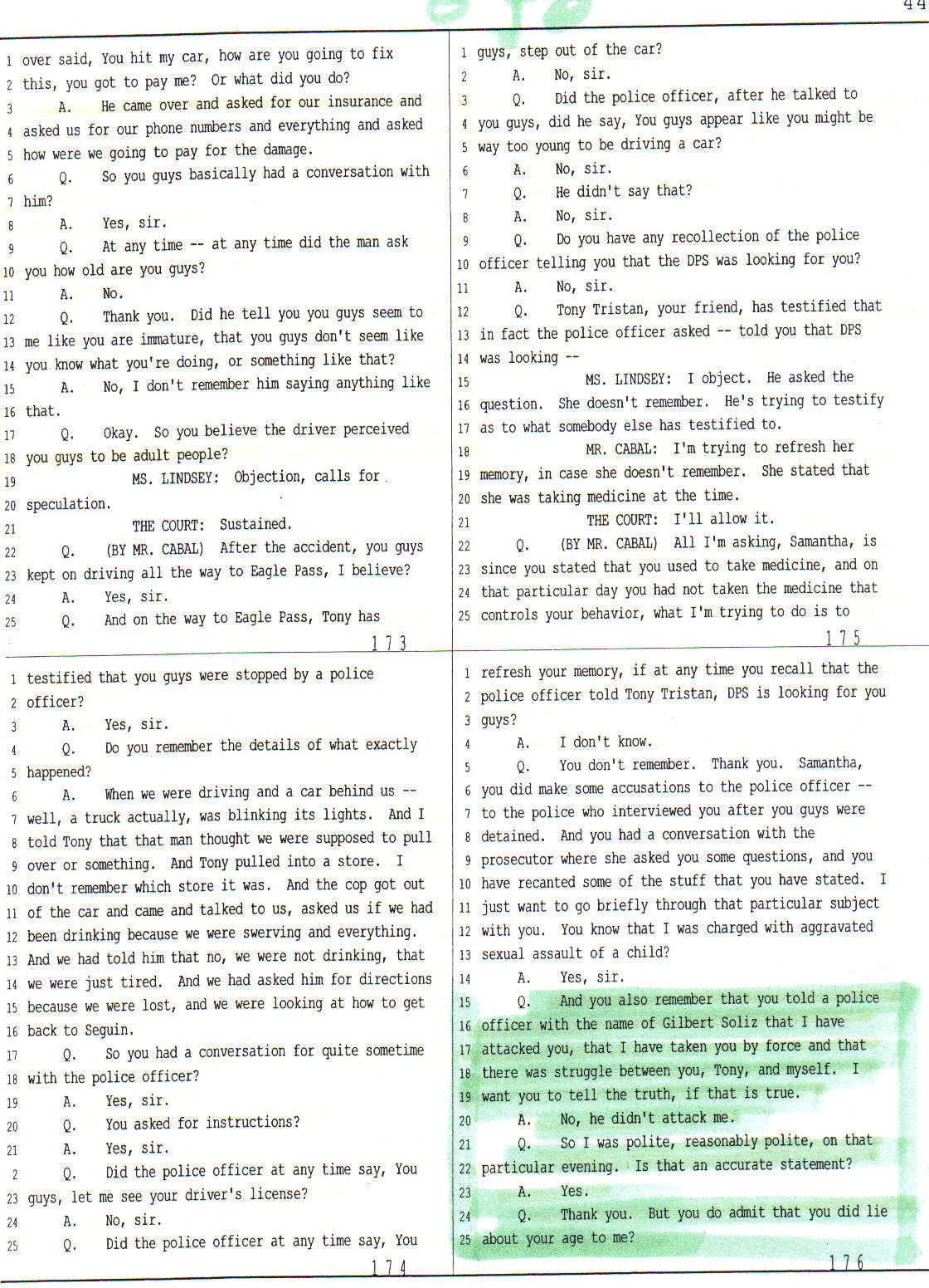 On pages 172 and 173 of the her testimony before the jury the alleged victim, Ms. Briones goes on to describe in detail how they got involved in an accident in San Antonio after stealing Jesus Cabal’s car, and somehow “engaged in insurance related negotiations” with the driver of the other vehicle without raising any suspicion on the other parties about their true ages.