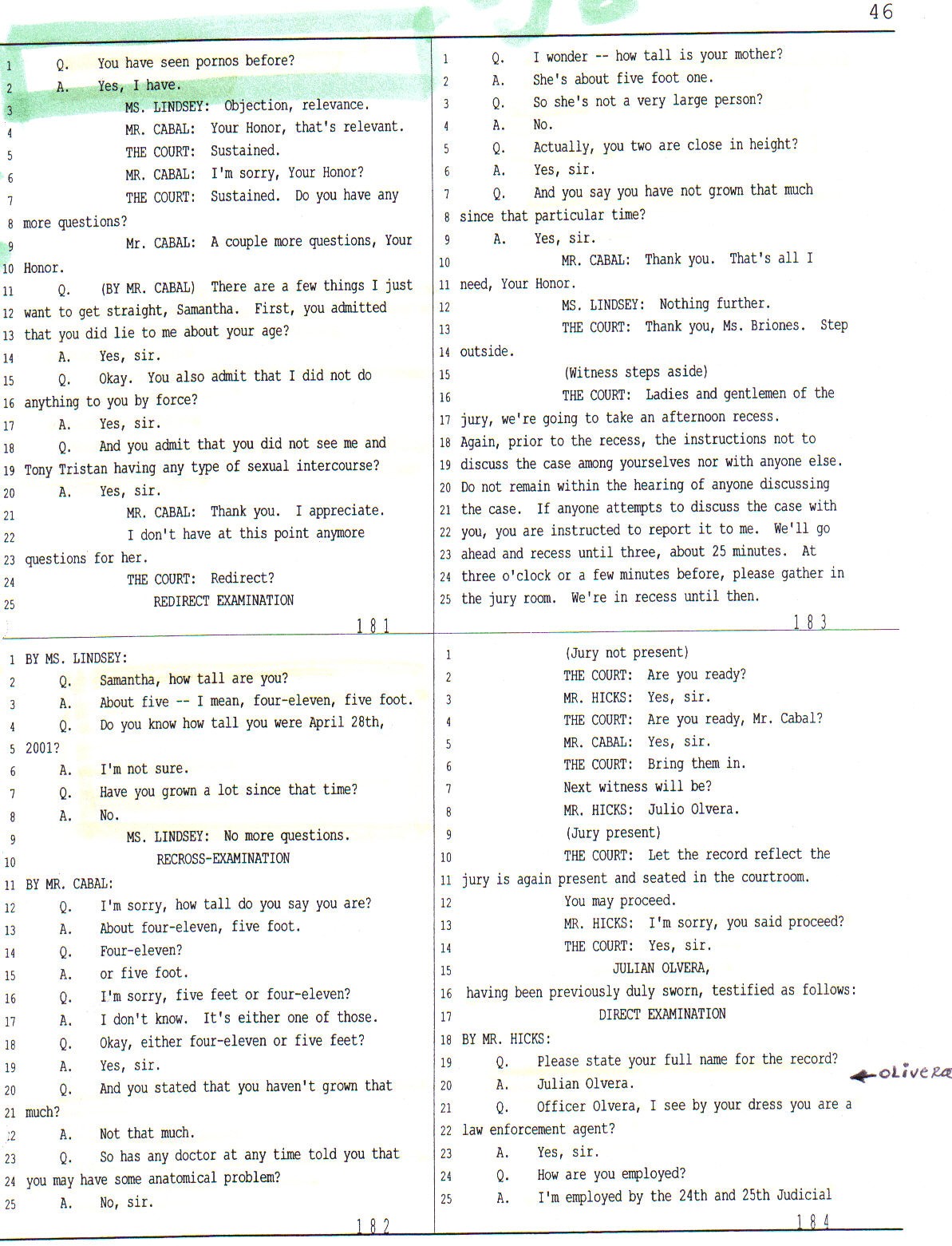 On pages 207 through 209 of Mr. Olivera’s testimony the judge and the prosecutor are trying to protect by all means agent Olivera in a cross examination which was leading to show that a conspiracy was unravelling that included police officers from Sequin and San Antonio aimed at “making up” a case against Mr. Cabal.