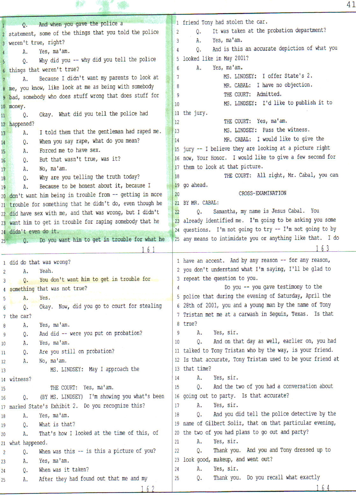 It was several days later after the car was recovered, when police officers from the city of Seguin, Texas, did advise Mr. Cabal that these “females” were just 13 ½ years old and that one of them was alleging to have been forced to have sex with him. Mr. Cabal denied to the police forcing anyone to engage in sexual activity with him and his testimony was corroborated by the young woman’s best friend (and partner in crime) who totally contradicted her friend’s testimony with the police. Moreover, this young woman herself (the alleged victim) " during the criminal trial of Jesus Alberto Cabal confessed that "her allegations of rape had been a lie all along" and that she had done it because wanted to hide from her mother the fact that she was engaging in prostitution to support her drug habits".