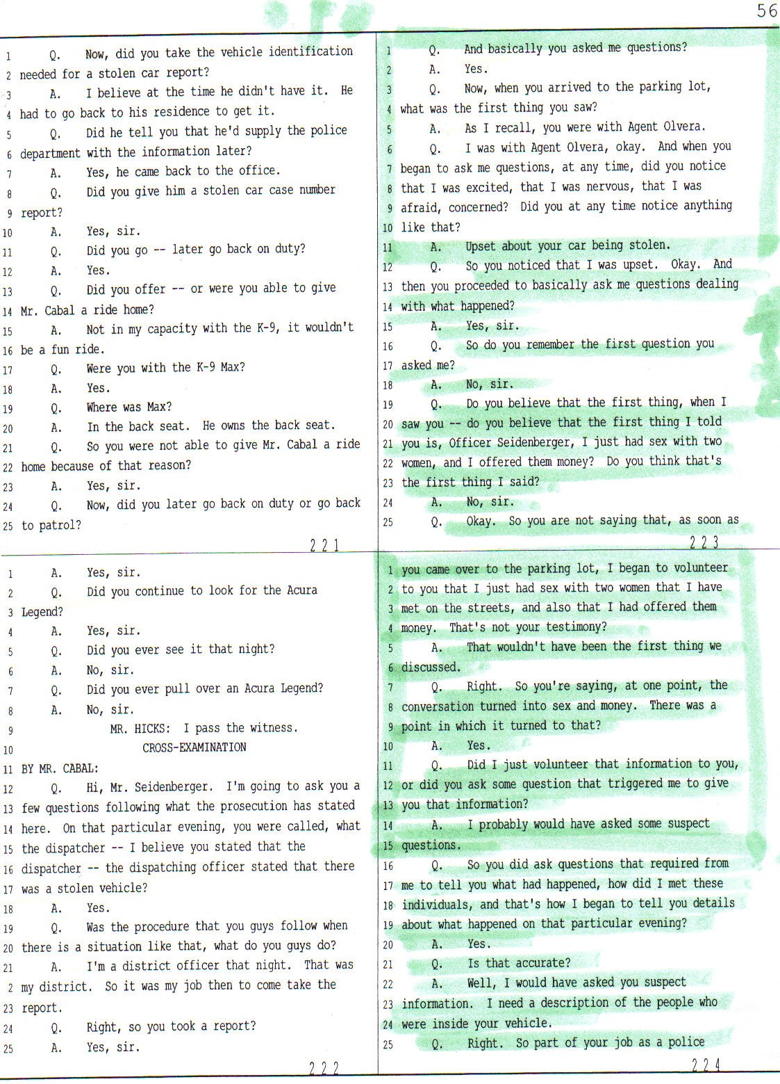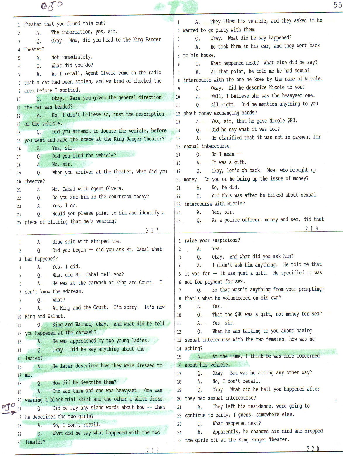 On Page 224 lines 1-15 of his testimony officer Seidenberger again is contradicting the prosecutor who was leading him on to say to the jury that Jesus Cabal had willingly started to volunteer information about having sex with the alleged victim without ever been asked any questions when he met Mr. Cabal at the theatre’s parking lot.