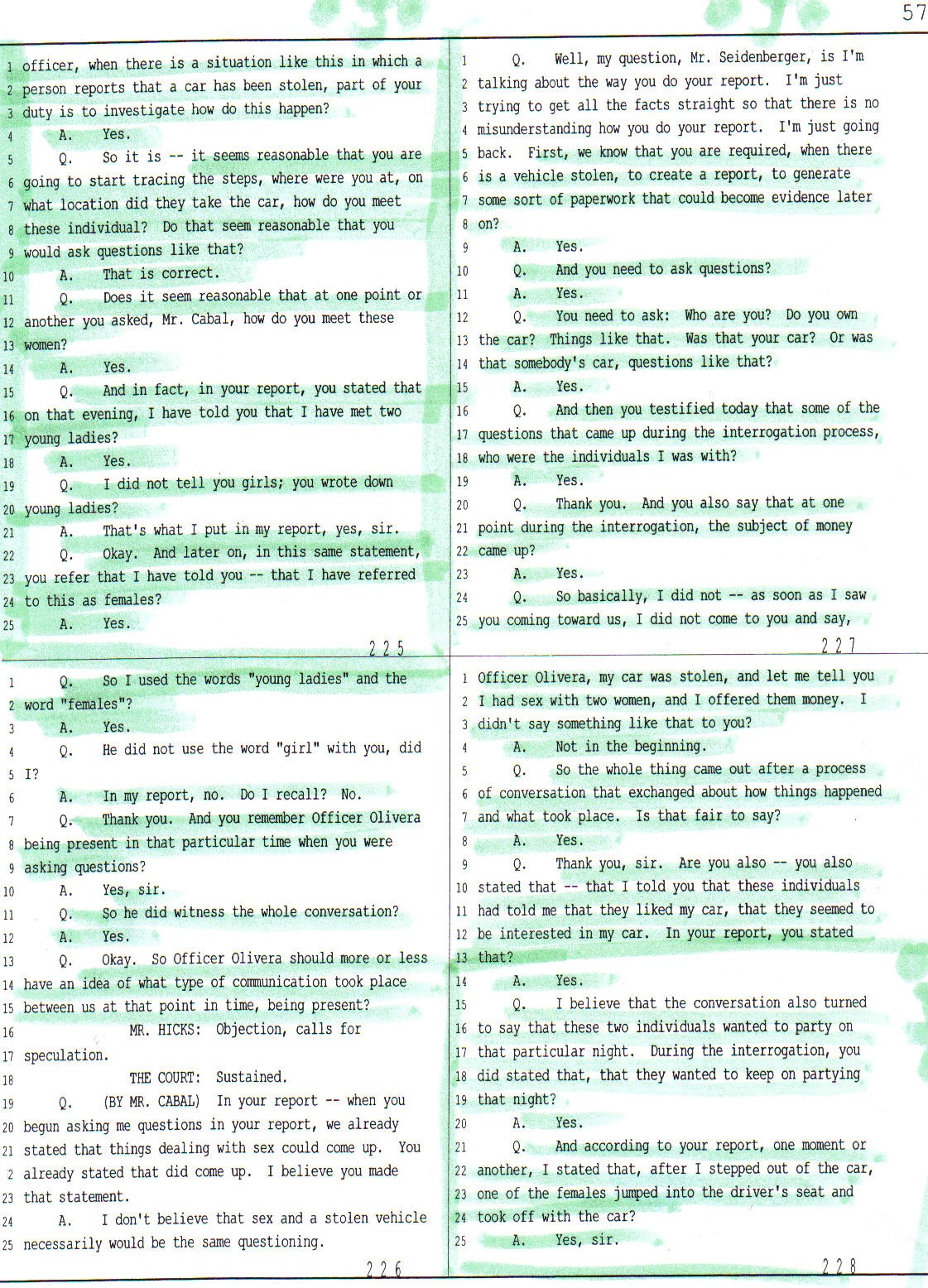 On page 225 lines 11-25, and page 226, lines 1-6 of his testimony officer Seidenberger is contradicting again the prosecutor who had been leading him on, and also agent Olivera’s previous testimony when stating that in fact Mr. Cabal had referred to the alleged victim and her friend as young ladies and not as “girls” as they were trying the make the jury believe.