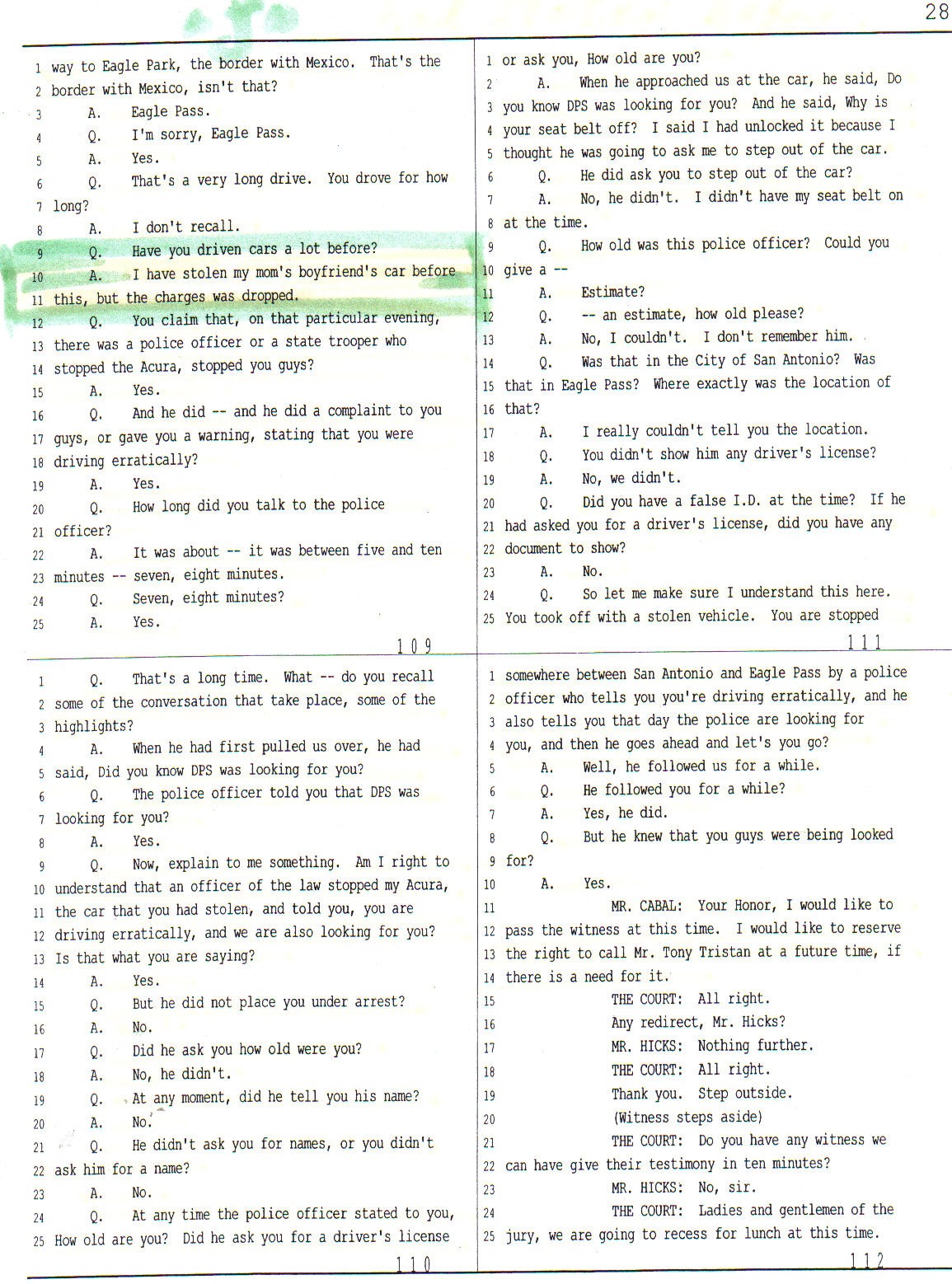 In fact, in addition to all the lies and contradictions by the police officers who testified on behalf of the state, a witness with the name of "Toni Tristan" who was present during the night of the alleged rape, and who on that night stole Mr. Cabal’s automobile with the alleged victim, clearly and shamelessly bragged during the trial that a police officer stopped them with a stolen vehicle, did not arrest them, nor asked them for drivers’ licenses, but that in fact “let them get away after warning them that they were being sought but the Texas authorities (D.P.S.”). In this regard please refer to pages 109 to 111 of Mr. Tristan’s testimony before the jury.